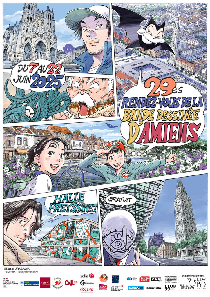 Cette année, les 29es Rendez-Vous de la Bande Dessinée ont résonné bien au-delà d’Amiens, dans tout le pays, et même plus loin encore ! Et pour cause : nous avions l’immense honneur d’accueillir un invité exceptionnel, une légende du manga, Naoki Urasawa. Maître incontesté du genre, auteur de séries cultes comme 20th Century Boys, Monster ou plus récemment Asadora!, il a marqué à jamais le festival, non seulement par sa présence lors de l’inauguration et du week-end d’ouverture des 7 et 8 juin, mais aussi par l’affiche qu’il a réalisée, où l’on retrouve ses personnages iconiques disséminés à travers toute la ville d’Amiens ! Ses œuvres ont également été célébrées à travers une double exposition :