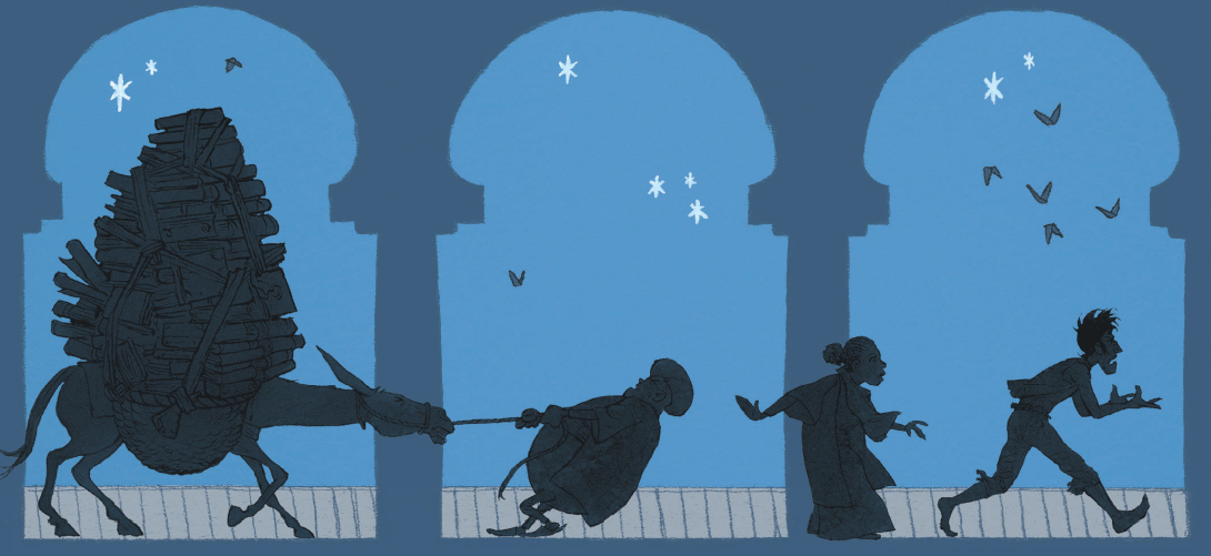 Voyant ce terrible événement s’approcher, Tarid, accompagné de Lubna et Marwan, va rassembler le maximum de livres sur le dos d’une mule pour sauvegarder ces précieux ouvrages.